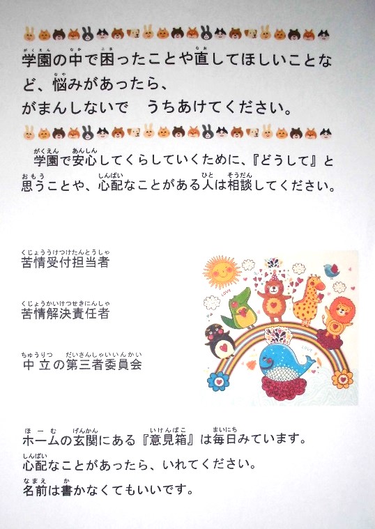 子どもたちが 安心感を持って、そして安全に生活できる快適な生活づくりのために、児童や保護者、その他代弁者等からの意見や苦情に適切に応じられるよう、当園では苦情解決の体制を整えております。
